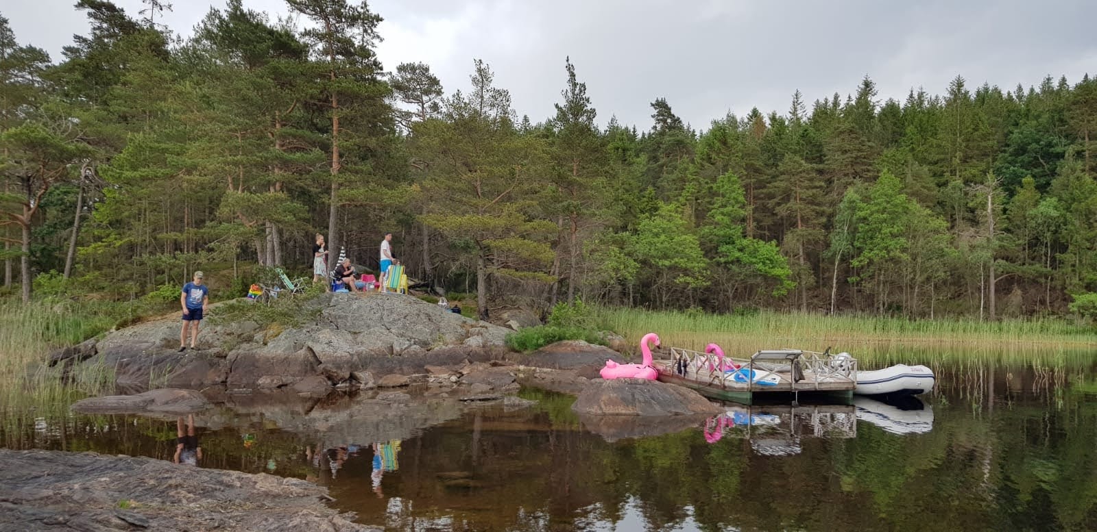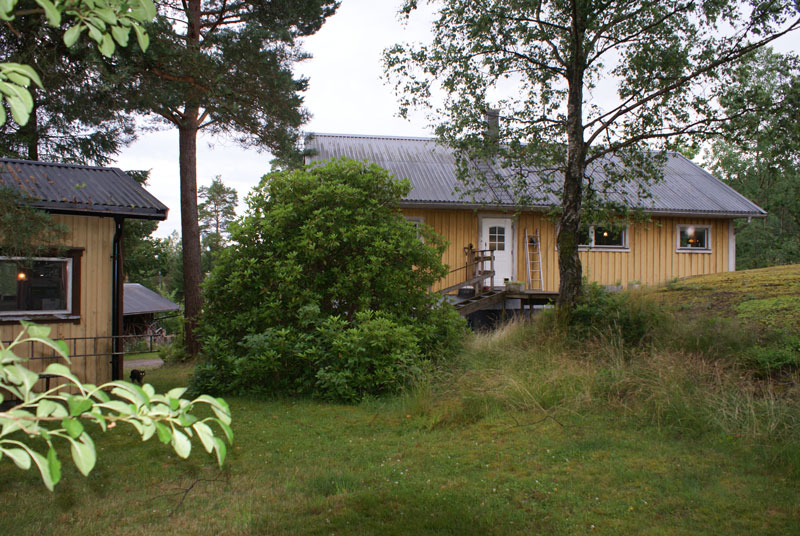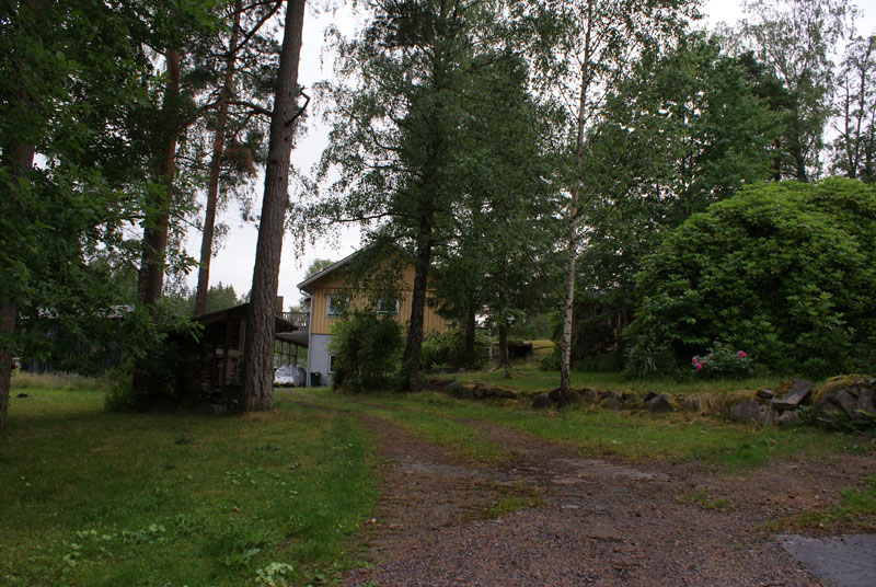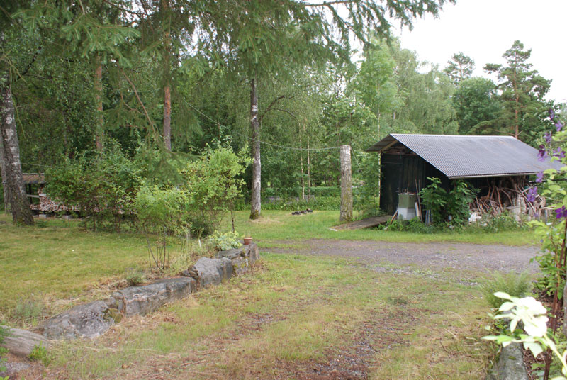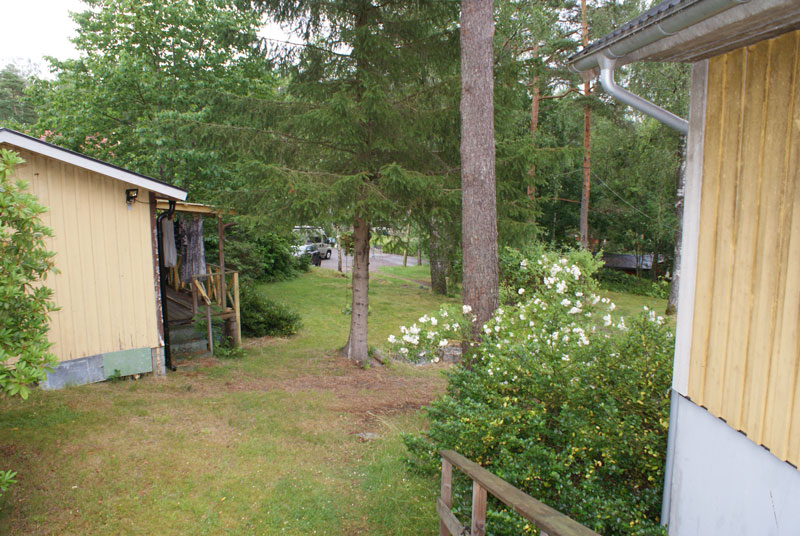 Huset ligger inte helt avskilt men tomten är över 3000 kvadratmeter. Grannarna är jättetrevliga. Det är nära till skogen och gångavstånd till badplats i en sjö. Det finns P-plats för flera bilar. Trädgården ingår i hyran och består till stor del av gräsmatta, men den har även en del rabatter med i huvudsak perenner, en del bärbuskar samt ett område som lämpar sig för odling om man vill.