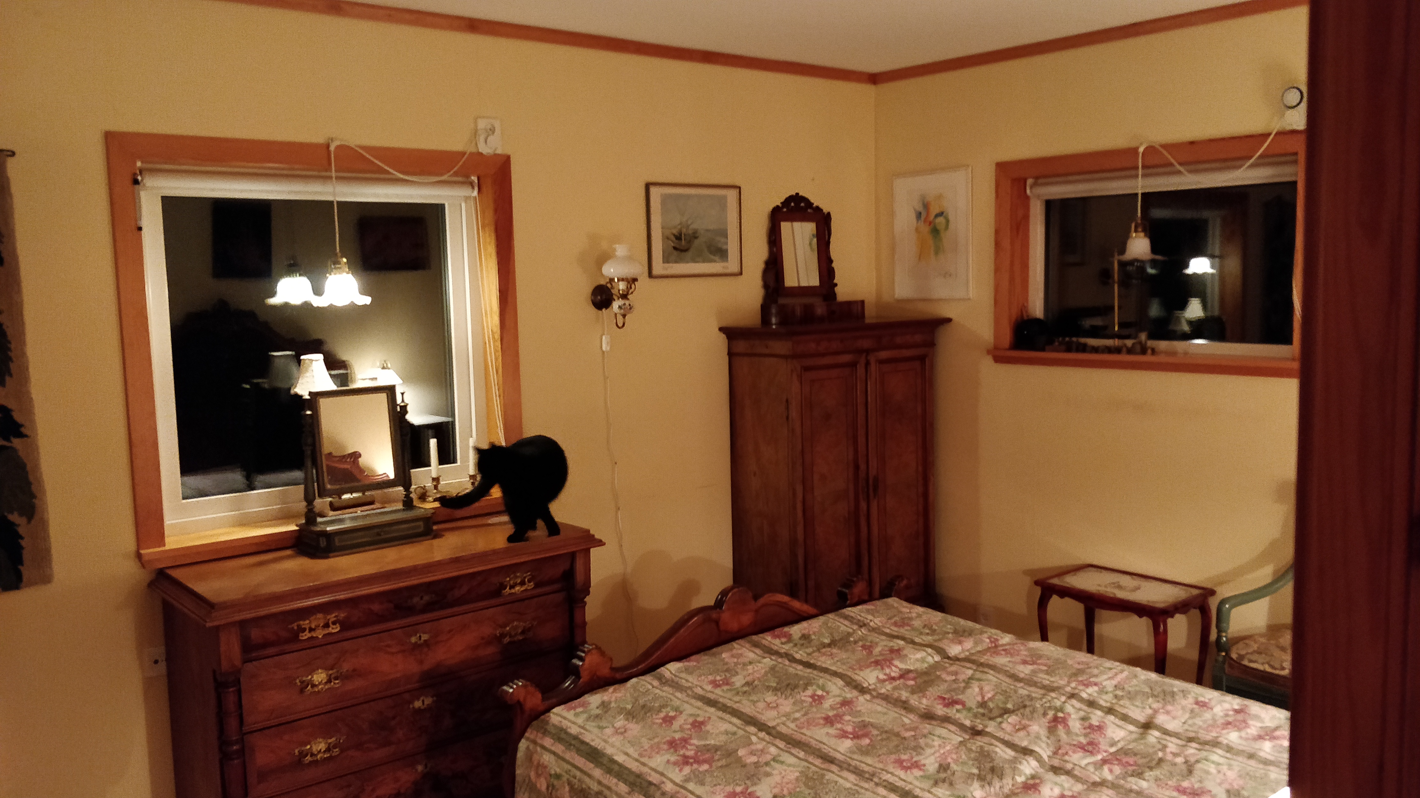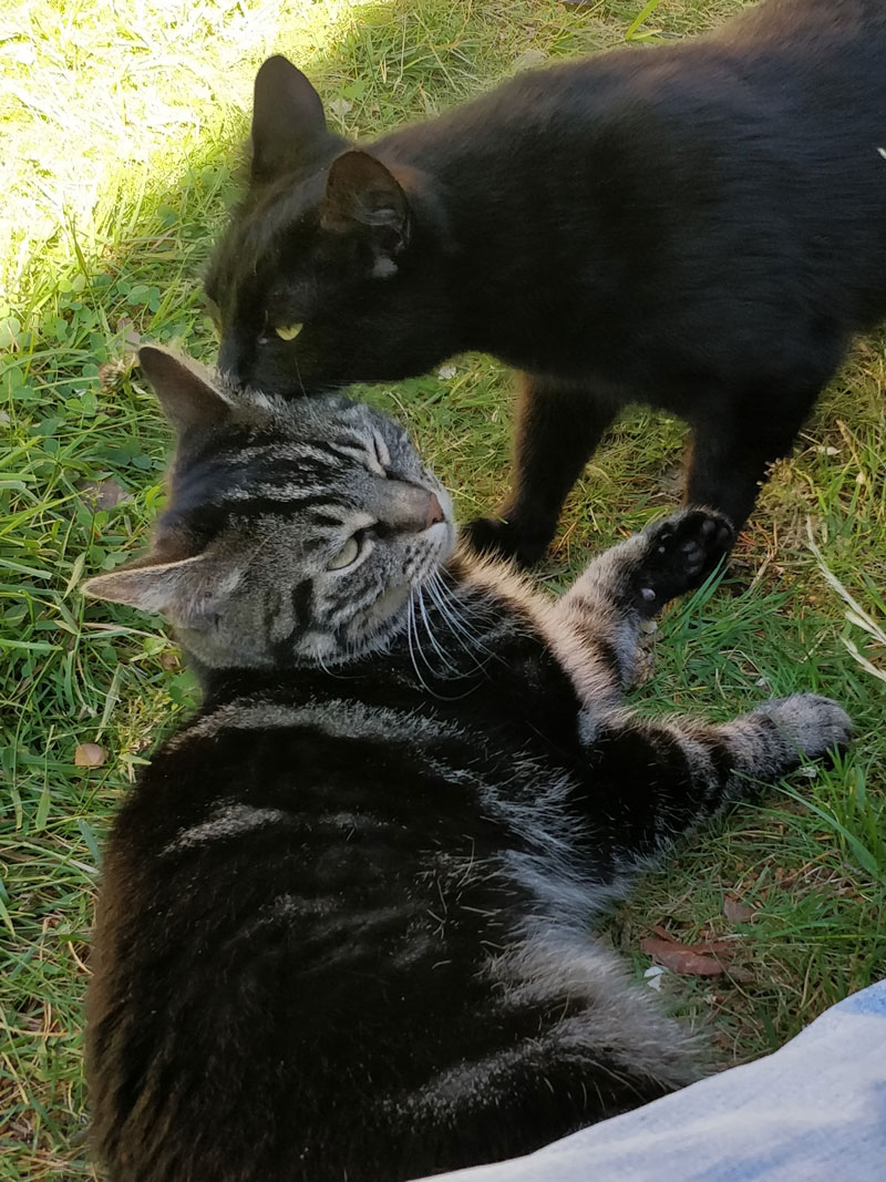 I huset bor två katter som behöver sällskap och omvårdnad. Innan min pappa dog lovade jag honom att katterna skulle få bo kvar. Vi står för alla kostnader för dem, och hittills har vi löst det genom att hyresgästen dragit av månadens utlägg från hyran. Katterna är syskonen Zola och Morty som är åtta år, och de är jättemysiga. De får gå ut och in som de vill, och det finns en katt-lucka både i ytterdörren och altan-dörren. Tidigare hyresgäst verkar ha lyckats vänja dem vid att uträtta sina behov utomhus, så de är enkla att sköta. De har vana av att bo med både andra katter och hundar. Tyvärr är min man och mina söner allergiska mot pälsdjur, så vi kan inte ta hand om dem själva.